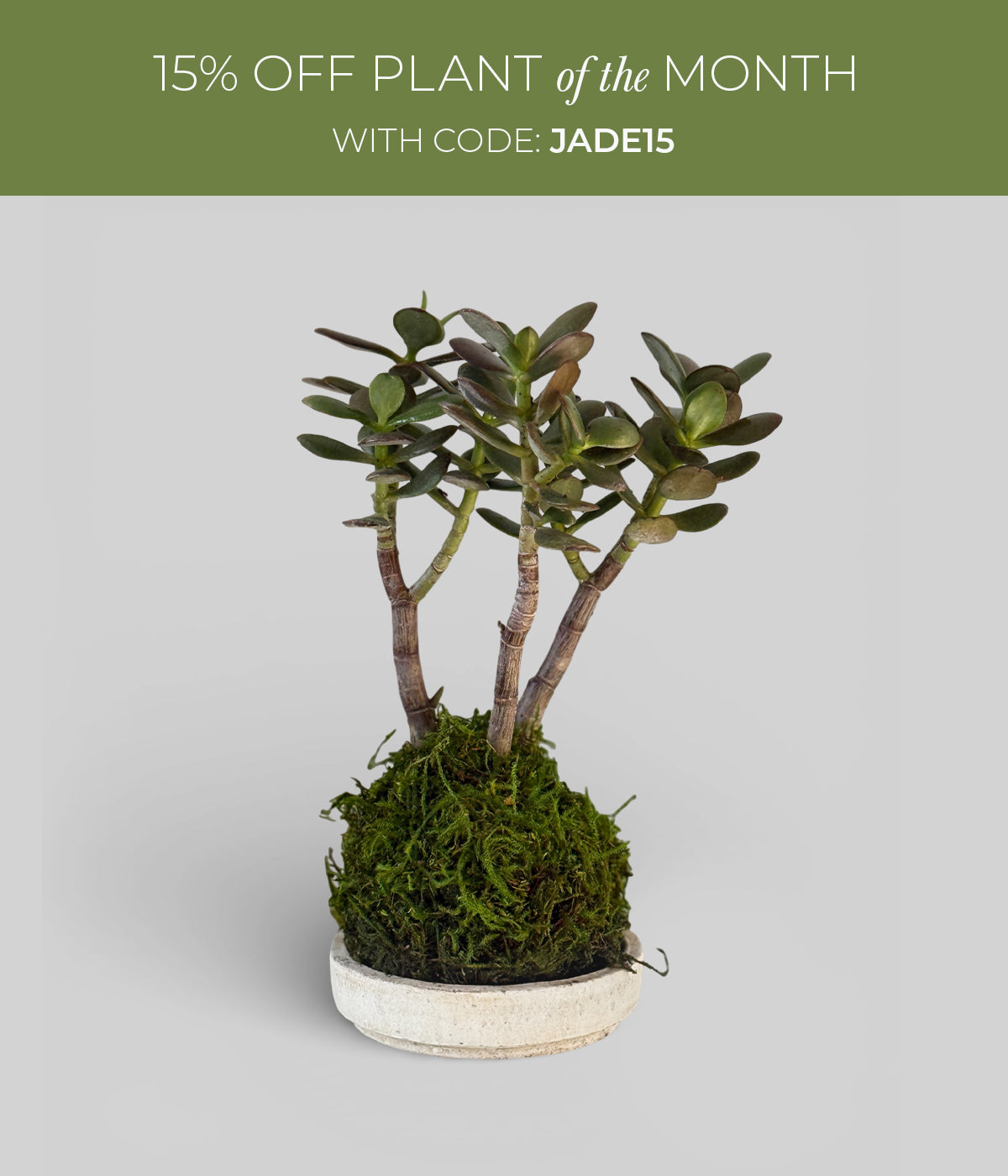 Thick, woody stems and glossy green leaves give this bonsai jade tree a sculptural character. Grown as a kokedama, the jade rises from a hand-formed moss sphere, bringing the look of a miniature tree into any room.