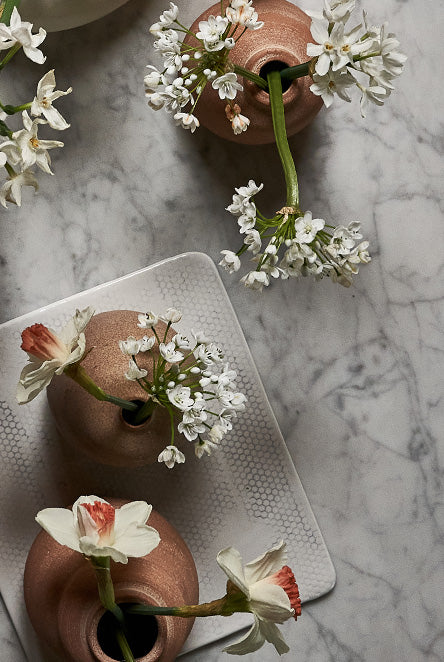 For refined, minimalist arrangements, sculptural vessels like the Ikebana Vase work beautifully. Simple clusters shine in the Terra Cotta Bud Vase, while Beach Stone Vases highlight just a few stems with ease. For statement displays, a large Novah Pitcher is perfectly suited to abundant arrangements.
