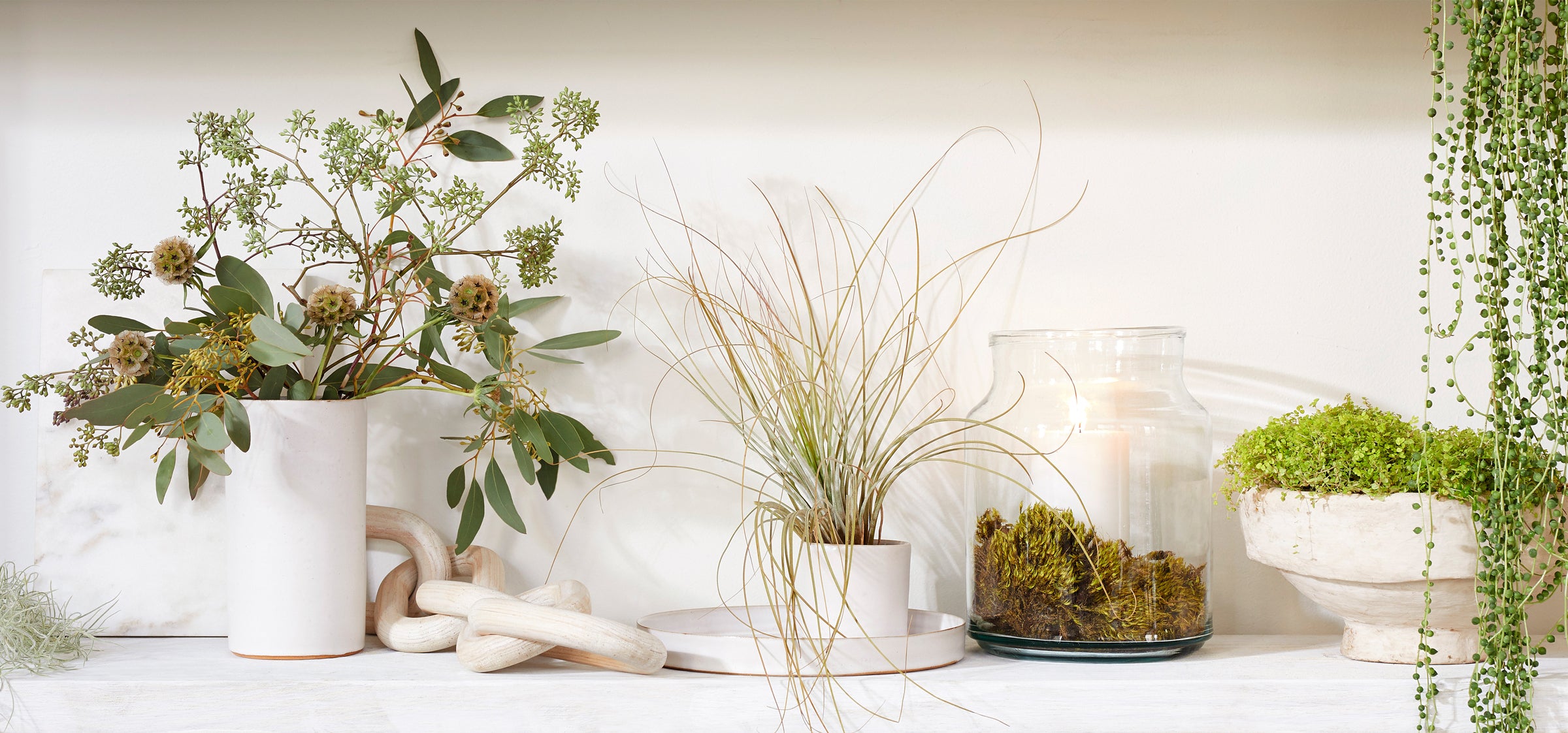 From left to right: Wood flower by Atuto; handmade ceramic vase by Yuko Sato under small recycled glass cloche; beach stone vase with dried silver brunia.