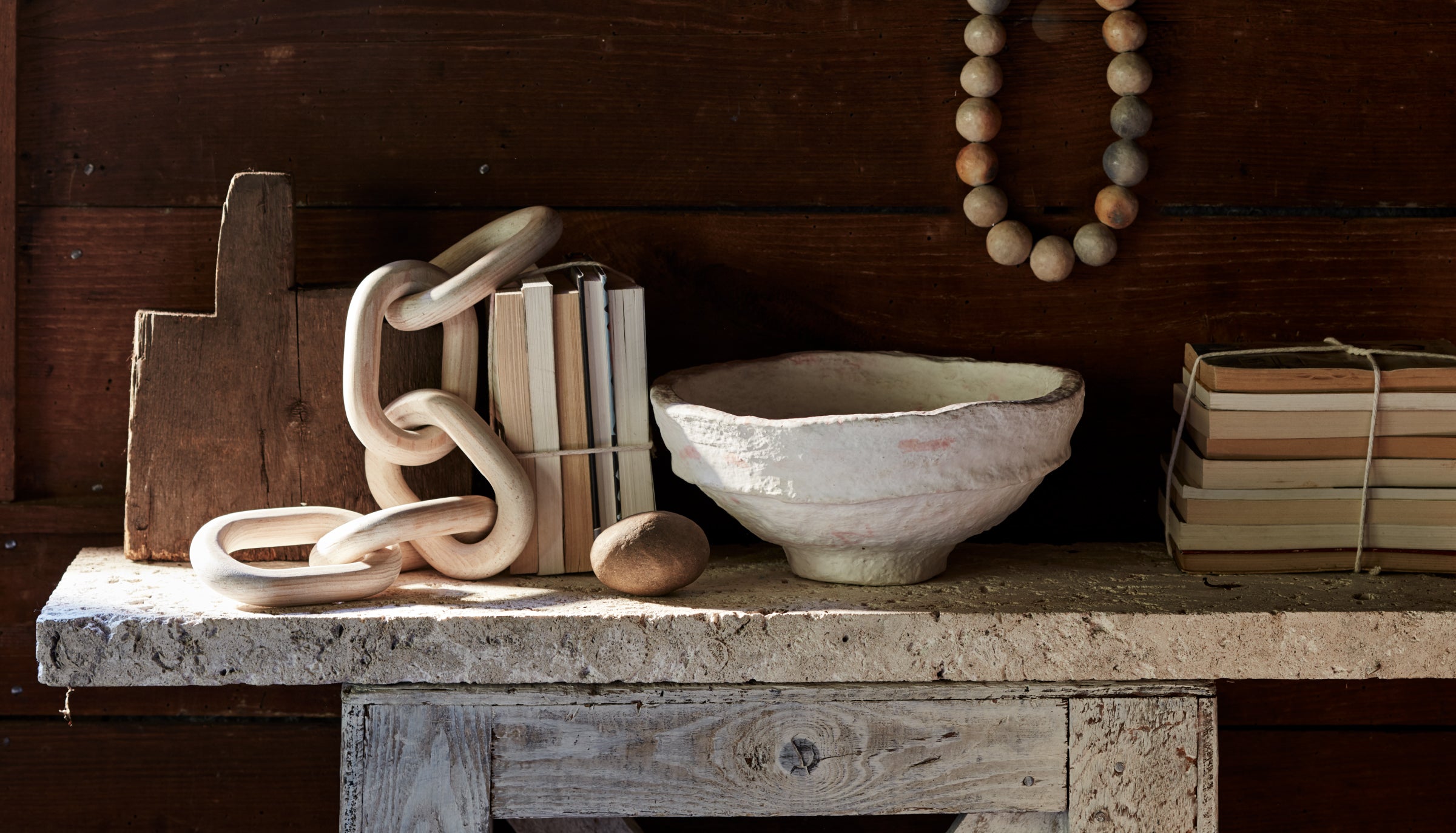 Hand carved, whitewashed wood chain by Atuto; paper mache bowl; Tunisian clay beads.