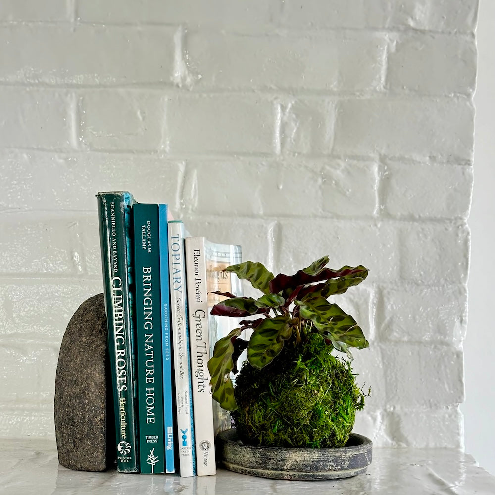Kokedama dates to around 1600 AD as an ancient form of Japanese bonsai. Each one is handcrafted to order by a small family-owned greenhouse in the Midwest using natural moss, soil, twine, and the plant itself. Native to Brazilian rainforests, the Calathea Rattlesnake (Goeppertia insignis) thrives in bright indirect light with high humidity. Comes with a Small Basic Tray in White Patina or Charcoal Patina. Plants arrive smaller than photographed, but eager to grow. Ships within 7-10 days, weather permitting.