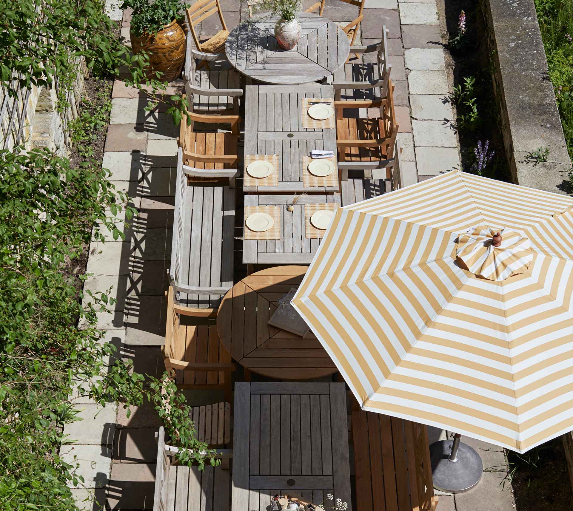 Quality Danish furniture designed to last for generations, Skagerak wooden tables and chairs are made to weather the seasons and invite connection amidst nature’s beauty. Pair with a jaunty striped umbrella and potted greens for a patio that feels like an extension of the earth.