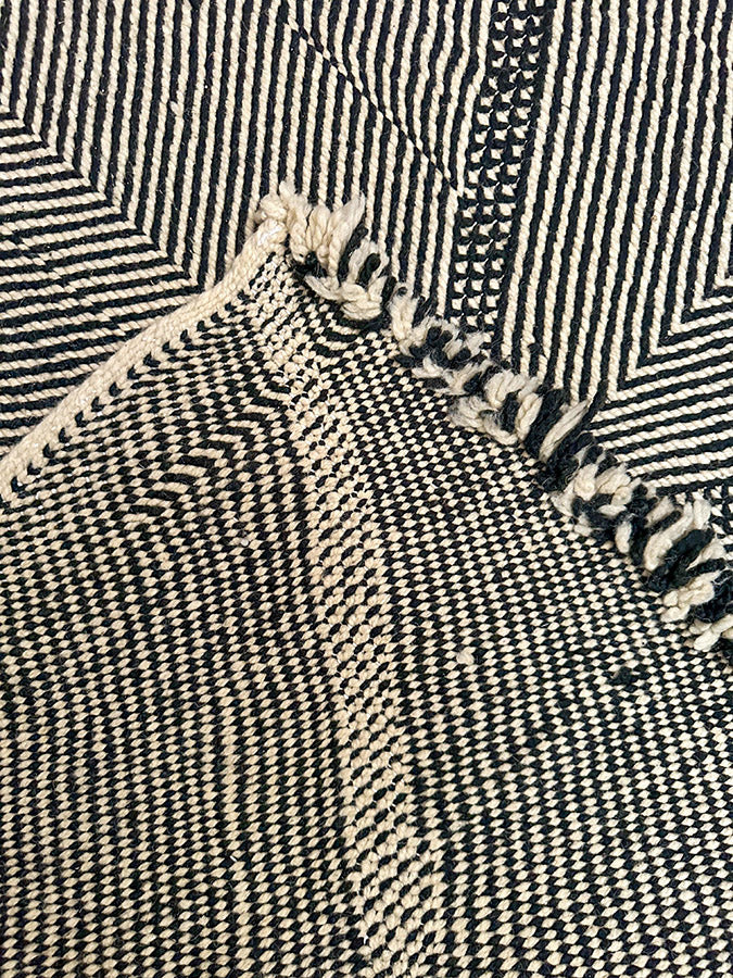 The Black and White Trellis Rug is a stunning example of traditional Moroccan craftsmanship, handwoven using the revered Zanafi weaving technique from the High Atlas Mountains. The intricate process requires skill and concentration, with each row carefully crafted through a precise counting system. The rug is reversible, with inverted symbols on each side, offering added depth and character.